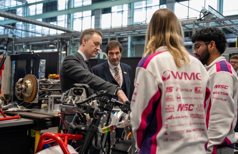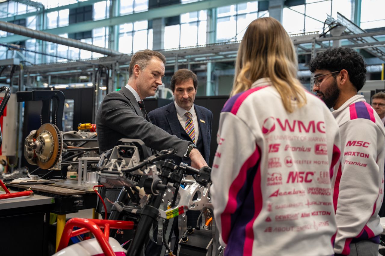 Chris McDonald MP visited the Warwick Moto workshop as part of his tour of the WMG facilities, where he met with the team to learn more about our work. Discussions focussed on our links to the UK’s advanced manufacturing sector, our approach to innovation, and the valuable skills students develop through their involvement in Warwick Moto.