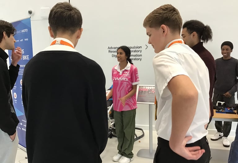 Students explored key engineering concepts through engaging activities, including demonstrations of gear ratios and the gyroscopic forces of a spinning wheel. These sessions provided a practical insight into how fundamental principles are applied in motorcycle design, helping to bring engineering to life in an accessible and exciting way.